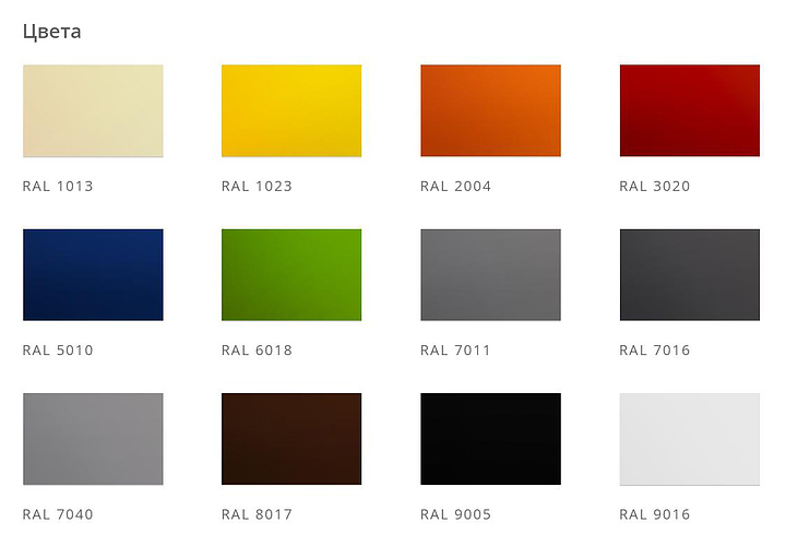 Модель доступна в 12 стандартных цветовых исполнениях панели по таблице RAL: 1013, 1023, 2004, 3020, 5010, 6018, 7011, 7016, 7040, 8017, 9005 и 9016.