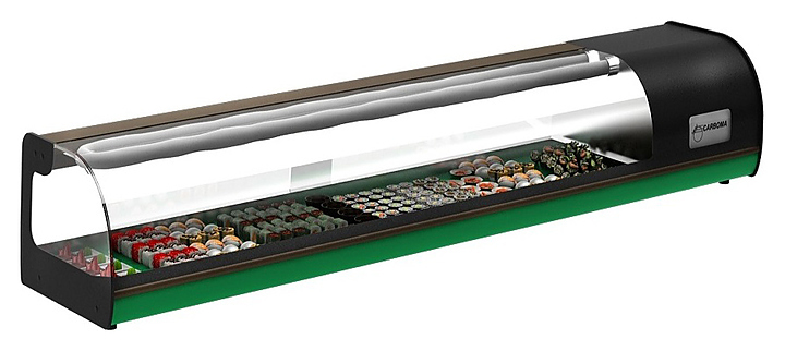 Холодильная витрина Carboma A37 SM 1,5-1 (ВХСв-1,5 суши-кейс) используется на предприятиях общественного питания и торговли для кратковременного хранения роллов, суши, сашими и других популярных японских блюд. Модель оснащена специальным зеленым ковриком и регулируемыми ножками высотой от 20 до 35 мм. Экспозиционная поверхность выполнена из шлифованной нержавеющей стали, ночные шторки - из оргстекла.