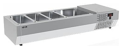 Холодильная витрина Carboma IDO IDO A40 SM 1,2 (3 GN1/3+1 GN1/2) используется на предприятиях общественного питания и торговли для охлаждения и кратковременного хранения ингредиентов для салатов. Модель оснащена электронным блоком управления. Корпус выполнен из нержавеющей стали, теплоизоляция - из пенополиуретана.