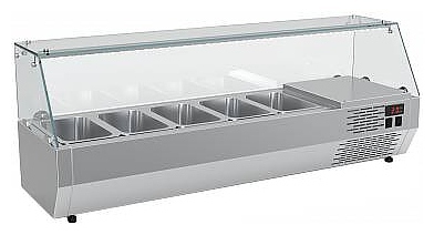 Холодильная витрина Carboma A30 SM 1,2-G (5 GN1/4) используется на предприятиях общественного питания и торговли для охлаждения и кратковременного хранения ингредиентов для салатов. Модель оснащена колпаком и LED подсветкой. Корпус выполнен из нержавеющей стали, теплоизоляция - из пенополиуретана, колпак - из стекла.