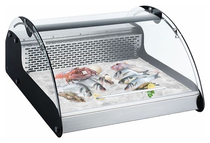 Настольная холодильная витрина? CRYSPI VIVO 1000 ВПСН используется на предприятиях общественного питания и торговли для эффектной демонстрации и кратковременного предпродажного хранения рыбы и других морепродуктов на колотом льду. Модель оснащена сферическим фронтальным стеклом с горизонтальной подъемной рукояткой. Рабочая и экспозиционная поверхности выполнены из высококачественной шлифованной нержавеющей стали AISI430, остекление купола – из закаленного стекла высокой степени прозрачности, боковые стекла с шелкографией черного цвета (RAL 9005), термоизоляция – из пенополиуретана.