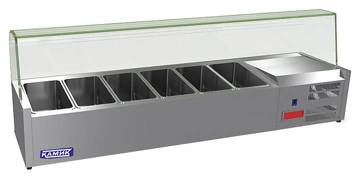 Холодильная витрина КАМИК ВХ-15040 используется на предприятиях общественного питания и торговли для охлаждения, демонстрации и кратковременного хранения топпингов. Модель оборудована защитным стеклом закругленной формы. Корпус выполнен из нержавеющей стали AISI 430 толщиной 1 мм.