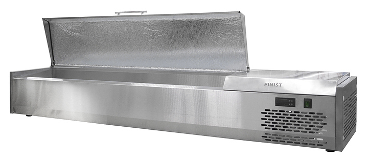 Настольная холодильная витрина Finist ToppingBox НХВкр-2,5 предназначена для демонстрации и кратковременного хранения подготовленных начинок и топпингов для пиццы, блинов, лапши WOK, а также мясных изделий и полуфабрикатов на предприятиях общественного питания и торговли. Модель оснащена крышкой, которая предотвращает попадание в гастроемкости посторонних предметов. Цельнозаливной корпус выполнен из высококачественной нержавеющей стали, отличающейся прочностью и долговечностью.