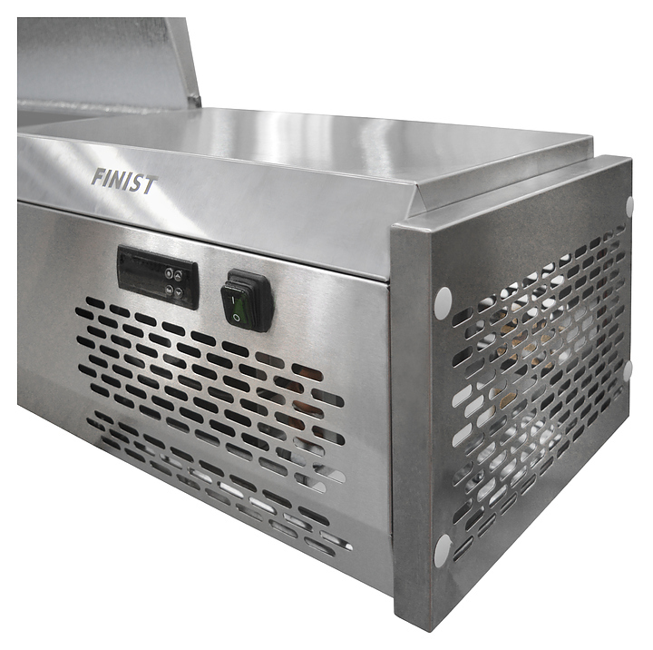 Настольная холодильная витрина Finist ToppingBox НХВкр-3,5 предназначена для демонстрации и кратковременного хранения подготовленных начинок и топпингов для пиццы, блинов, лапши WOK, а также мясных изделий и полуфабрикатов на предприятиях общественного питания и торговли. Модель оснащена крышкой, которая предотвращает попадание в гастроемкости посторонних предметов. Цельнозаливной корпус выполнен из высококачественной нержавеющей стали, отличающейся прочностью и долговечностью.