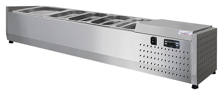 Настольная холодильная витрина Finist ToppingBox НХВо-4.5 предназначена для демонстрации и кратковременного хранения подготовленных начинок и топпингов для пиццы, блинов, лапши WOK, а также мясных изделий и полуфабрикатов на предприятиях общественного питания и торговли. Модель оснащена открытой камерой для размещения гастроемкостей, устойчивыми ножками, кабелем питания с вилкой и кнопочной панелью управления с цифровым дисплеем. Цельнозаливной корпус выполнен из высококачественной нержавеющей стали.