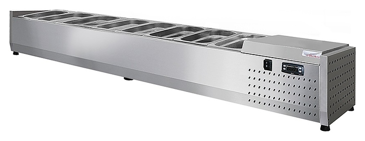 Настольная холодильная витрина Finist ToppingBox НХВо-8 предназначена для демонстрации и кратковременного хранения подготовленных начинок и топпингов для пиццы, блинов, лапши WOK, а также мясных изделий и полуфабрикатов на предприятиях общественного питания и торговли. Модель оснащена открытой камерой для размещения гастроемкостей, устойчивыми ножками, кабелем питания с вилкой и кнопочной панелью управления с цифровым дисплеем. Цельнозаливной корпус выполнен из высококачественной нержавеющей стали.