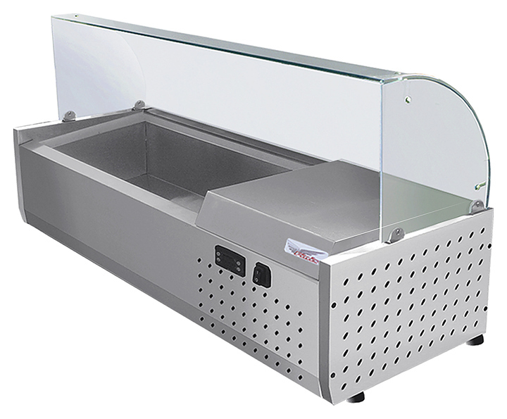 Настольная холодильная витрина Finist ToppingBox НХВсм-9 предназначена для демонстрации и кратковременного хранения подготовленных начинок и топпингов для пиццы, блинов, лапши WOK, а также мясных изделий и полуфабрикатов на предприятиях общественного питания и торговли. Модель оснащена камерой для размещения гастроемкостей, куполом с моллированным выпуклым остеклением, устойчивыми опорами, кабелем питания и кнопочной панелью управления с цифровым дисплеем. Корпус выполнен из высококачественной нержавеющей стали.