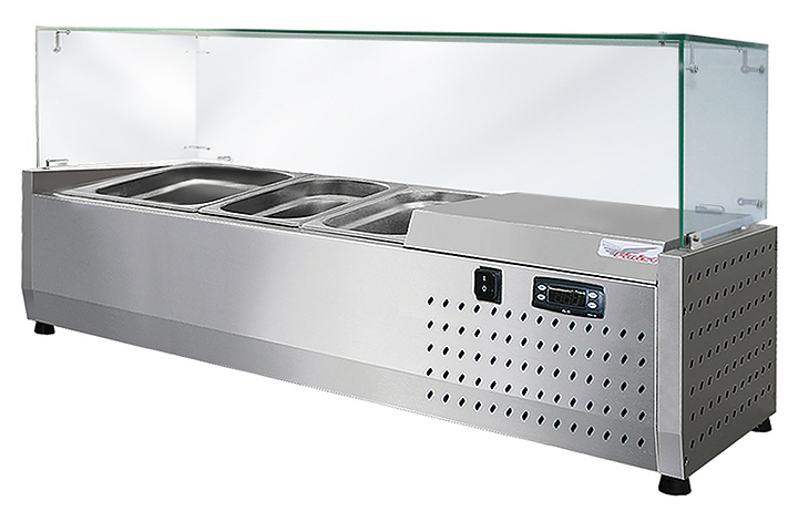 Настольная холодильная витрина Finist ToppingBox НХВсп-2,5 предназначена для демонстрации и кратковременного хранения подготовленных начинок и топпингов для пиццы, блинов, лапши WOK, а также мясных изделий и полуфабрикатов на предприятиях общественного питания и торговли. Прямоугольный купол предотвращает попадание в гастроемкости посторонних предметов. Цельнозаливной корпус выполнен из высококачественной нержавеющей стали, отличающейся прочностью и долговечностью, купол - из стекла.