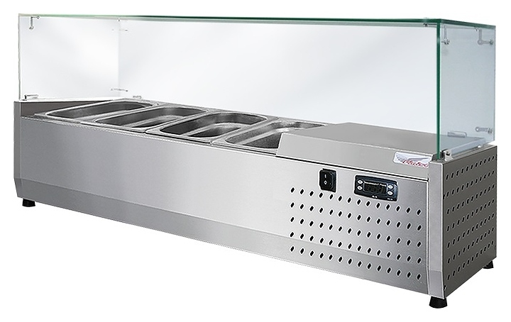Настольная холодильная витрина Finist ToppingBox НХВсп-4 предназначена для демонстрации и кратковременного хранения подготовленных начинок и топпингов для пиццы, блинов, лапши WOK, а также мясных изделий и полуфабрикатов на предприятиях общественного питания и торговли. Модель оснащена камерой для размещения гастроемкостей, куполом с прямоугольными панелями, устойчивыми ножками, кабелем питания с вилкой и кнопочной панелью управления с цифровым дисплеем. Цельнозаливной корпус выполнен из высококачественной нержавеющей стали, купол – из прочного стекла.