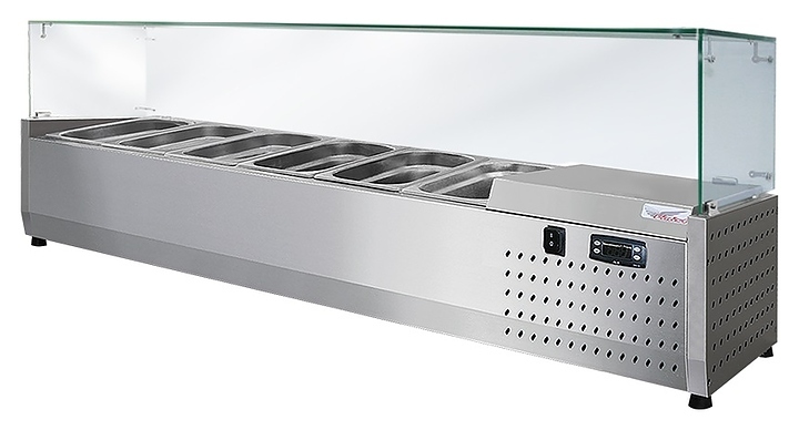 Настольная холодильная витрина Finist ToppingBox НХВсп-6 предназначена для демонстрации и кратковременного хранения подготовленных начинок и топпингов для пиццы, блинов, лапши WOK, а также мясных изделий и полуфабрикатов на предприятиях общественного питания и торговли. Модель оснащена камерой для размещения гастроемкостей, куполом с прямоугольными панелями, устойчивыми ножками, кабелем питания с вилкой и кнопочной панелью управления с цифровым дисплеем. Цельнозаливной корпус выполнен из высококачественной нержавеющей стали, купол – из прочного стекла.