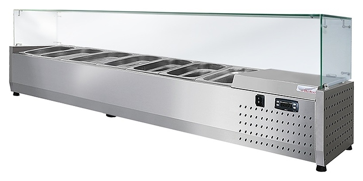 Настольная холодильная витрина Finist ToppingBox НХВсп-7 предназначена для демонстрации и кратковременного хранения подготовленных начинок и топпингов для пиццы, блинов, лапши WOK, а также мясных изделий и полуфабрикатов на предприятиях общественного питания и торговли. Модель оснащена камерой для размещения гастроемкостей, куполом с прямоугольными панелями, устойчивыми ножками, кабелем питания с вилкой и кнопочной панелью управления с цифровым дисплеем. Цельнозаливной корпус выполнен из высококачественной нержавеющей стали, купол – из прочного стекла.