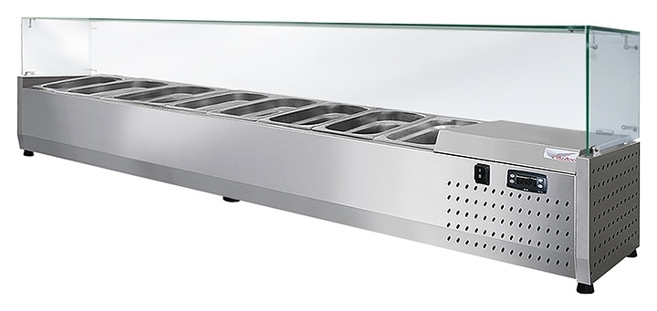 Настольная холодильная витрина Finist ToppingBox НХВсп-8 предназначена для демонстрации и кратковременного хранения подготовленных начинок и топпингов для пиццы, блинов, лапши WOK, а также мясных изделий и полуфабрикатов на предприятиях общественного питания и торговли. Модель оснащена камерой для размещения гастроемкостей, куполом с прямоугольными панелями, устойчивыми ножками, кабелем питания с вилкой и кнопочной панелью управления с цифровым дисплеем. Цельнозаливной корпус выполнен из высококачественной нержавеющей стали, купол – из прочного стекла.
