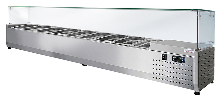 Настольная холодильная витрина Finist ToppingBox НХВсп-9 предназначена для демонстрации и кратковременного хранения подготовленных начинок и топпингов для пиццы, блинов, лапши WOK, а также мясных изделий и полуфабрикатов на предприятиях общественного питания и торговли. Прямоугольный купол предотвращает попадание в гастроемкости посторонних предметов. Цельнозаливной корпус выполнен из высококачественной нержавеющей стали, отличающейся прочностью и долговечностью, купол - из стекла.