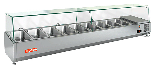 Настольная холодильная витрина HICOLD VRTG 1970 используется на предприятиях общественного питания и торговли для демонстрации, охлаждения и кратковременного хранения салатов, гарниров, закусок и других готовых блюд. Модель оснащена стеклянной надстройкой и ножками. Изделие выполнено из нержавеющей стали.