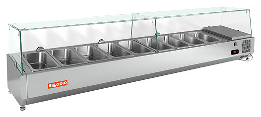 Настольная холодильная витрина HICOLD VRTG 2010 (1/3) используется на предприятиях общественного питания и торговли для демонстрации, охлаждения и кратковременного хранения салатов, гарниров, закусок и других готовых блюд. Модель оснащена электронной панелью управления, стеклянной надстройкой и опорными ножками. Корпус выполнен из нержавеющей стали.