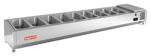 Настольная холодильная витрина HICOLD VRTO 1970 используется на предприятиях общественного питания и торговли для демонстрации, охлаждения и кратковременного хранения салатов, гарниров, закусок и других готовых блюд. Модель оснащена ножками. Изделие выполнено из нержавеющей стали.