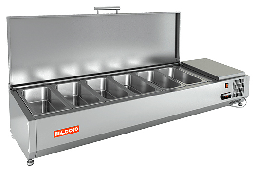 Настольная холодильная витрина HICOLD VRTU 1425 используется на предприятиях общественного питания и торговли для демонстрации, охлаждения и кратковременного хранения салатов, гарниров, закусок и других готовых блюд. Модель оснащена крышкой и специальным креплением для стола. Изделие выполнено из нержавеющей стали.
