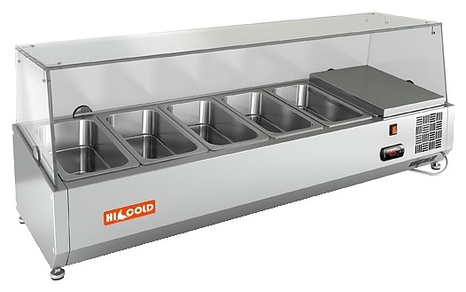 Настольная холодильная витрина HICOLD VRX 1200 используется на предприятиях общественного питания и торговли для демонстрации, охлаждения и кратковременного хранения салатов, гарниров, закусок и других готовых блюд. Модель оснащена стеклянной надстройкой и ножками. Изделие выполнено из нержавеющей стали.