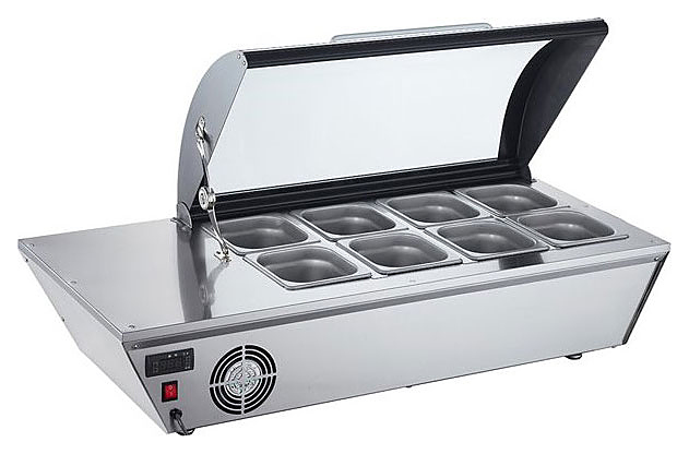 В комплект поставки входят 8 гастроемкостей GN 1/6 из нержавеющей стали AISI 201 глубиной 100 мм из нержавеющей стали AISI201 без крышек.