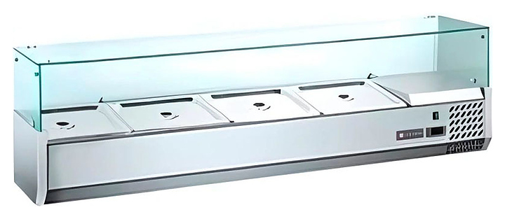 Настольная холодильная витрина? Tatra TVR1200-4GN1/3 используется на предприятиях общественного питания и торговли для демонстрации и кратковременного хранения ингредиентов, салатов и готовых блюд в гастроемкостях. Модель оснащена встроенным холодильным агрегатом с боковым расположением, цифровым термостатом и козырьком. Корпус выполнен из высококачественной нержавеющей стали, козырек - из прямоугольных стеклянных панелей.