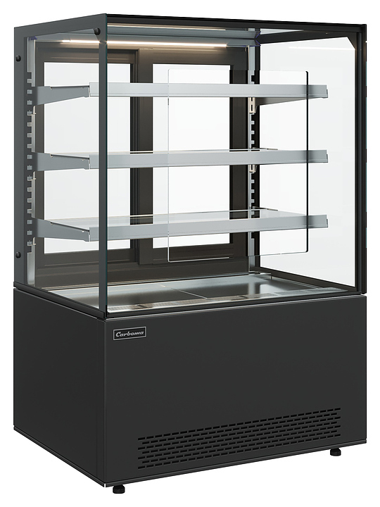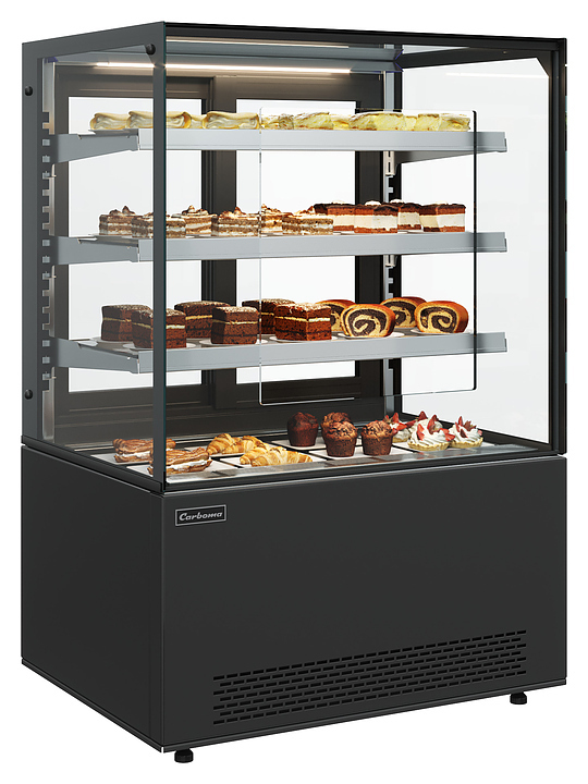 Кондитерская витрина самообслуживания? Carboma KC71-130 VV 1,2-2 COSMO (self, оргстекло) используется на предприятиях общественного питания и торговли для демонстрации, охлаждения и кратковременного хранения напитков, тортов, пирожных и других кондитерских изделий и гастрономических товаров. Модель оснащена 3 регулируемыми по уровню стеклянными полками со встроенными ценникодержателями и регулируемыми ножками от 30 до 50 мм. Корпус выполнен из стали и пластика, термоизоляция корпуса - из пенополиуретана, базовая выкладка - из матового стекла, остекление - из структурного стеклопакета, фронт - из оргстекла.