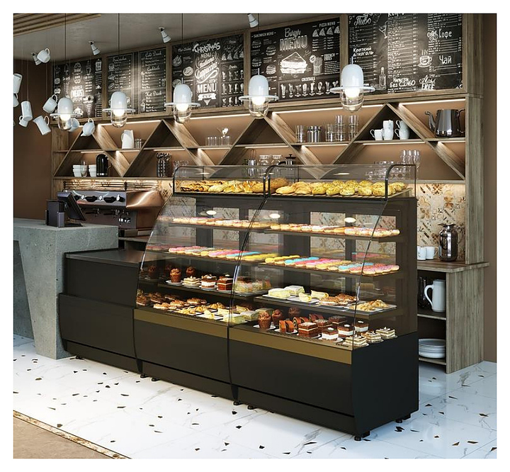 Кондитерская витрина Carboma K70 VV 1,3-1 Standard версия 2.0 используется на предприятиях общественного питания и торговли для демонстрации, охлаждения и кратковременного хранения тортов, пирожных и других кондитерских изделий. Модель оснащена гнутым фронтальным стеклом и боковыми прямыми стеклами без металлических рамок, обеспечивающими улучшенный обзор продукции, и задними створками-слайдерами со встроенной ручкой.