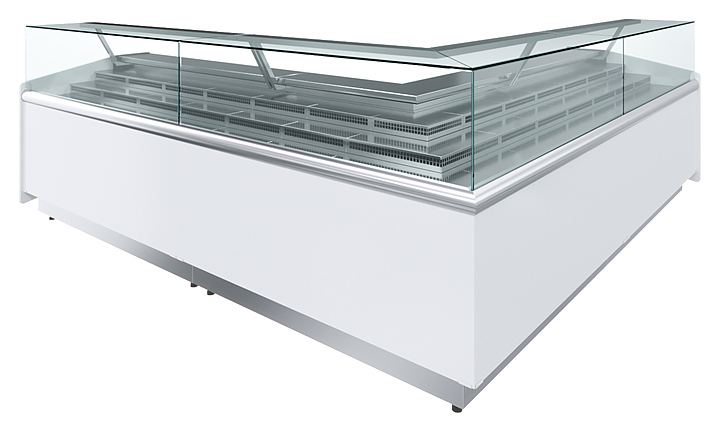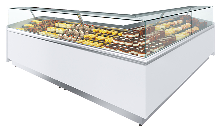 Угловая кондитерская витрина Carboma KC82 SM-5 01 используется на предприятиях общественного питания и торговли для демонстрации, охлаждения и кратковременного хранения тортов, пирожных и других кондитерских изделий. Модель оснащена прямым передним стеклом и регулируемыми ножками высотой от 30 до 50 м. Корпус выполнен из стали с ППУ-теплоизоляцией, зона выкладки и столешница - из нержавеющей стали, раздвижные задние створки - из оргстекла, передняя панель - из МДФ белого цвета или декорированного под дерево.