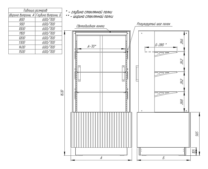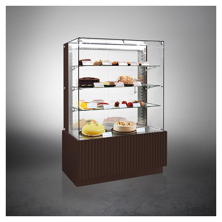 Напольная кондитерская витрина Finist AIR LUX AL-11-6-163 предназначена для кратковременного хранения и предпродажной демонстрации десертов и кондитерских изделий на предприятиях общественного питания и торговли. Модель оснащена раздвижными дверьми-купе, 3 полками и подсветкой. Фасады выполнены из МДФ, полки - из стекла, дно витрины - из зеркальной нержавеющей стали.