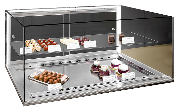 Встраиваемая горизонтальная витрина Finist Glassier G812-14/55/5 предназначена для кратковременного хранения и предпродажной демонстрации десертов, шоколадных изделий, конфет или пралине на предприятиях общественного питания и торговли. Модель оснащена 2 дверьми со стороны продавца, полкой, светодиодной подсветкой и может монтироваться в столешницу из любого материала. Купол витрины имеет большую площадь остекления, что помогает беспрепятственно разглядеть товар со всех сторон. Каркас и столешница выполнены из зеркальной нержавеющей стали, купол - из просветленного стекла, полка - из стекла и агрегатная часть - из крашеной стали.