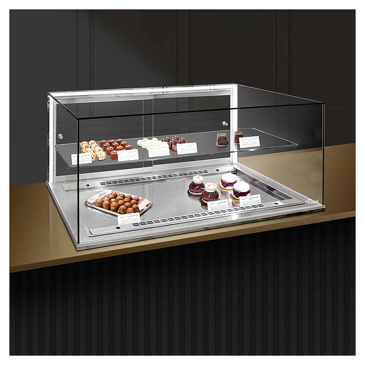 Встраиваемая горизонтальная витрина Finist Glassier G812-15/55/5 предназначена для кратковременного хранения и предпродажной демонстрации десертов, шоколадных изделий, конфет или пралине на предприятиях общественного питания и торговли. Модель оснащена 2 дверьми со стороны продавца, полкой, светодиодной подсветкой и может монтироваться в столешницу из любого материала. Купол витрины имеет большую площадь остекления, что помогает беспрепятственно разглядеть товар со всех сторон. Каркас и столешница выполнены из зеркальной нержавеющей стали, купол - из просветленного стекла, полка - из стекла и агрегатная часть - из крашеной стали.