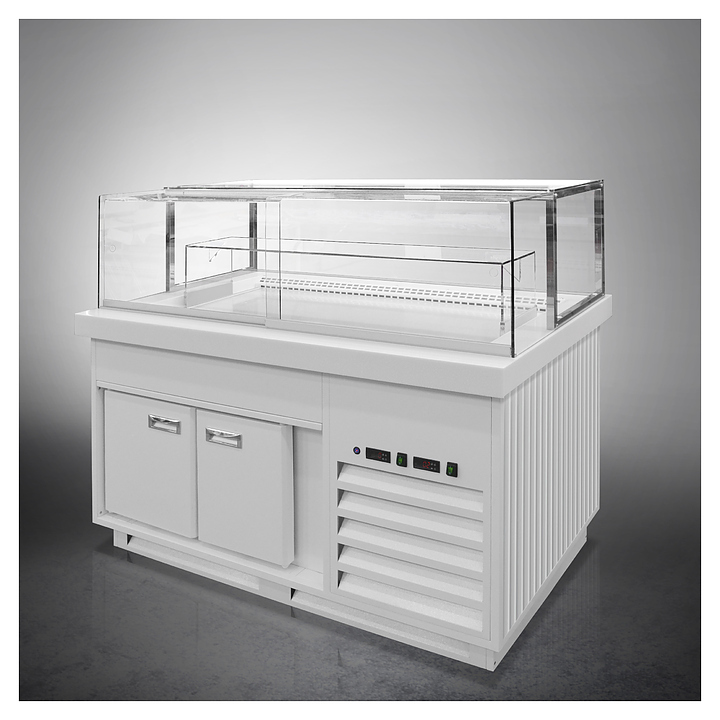 Напольная кондитерская витрина Finist Maria Msv-19-9 предназначена для кратковременного хранения и предпродажной демонстрации десертов и кондитерских изделий на предприятиях общественного питания и торговли. Модель оснащена охлаждаемой камерой-накопителем, выдвижной полкой, столешницей и подсветкой. Фасады выполнены из МДФ, купол - из просветленного стекла, двери-купе - из оргстекла, зона выкладки и столешница - из искусственного камня, который отличается прочностью, долговечностью, гигиеничностью, легко очищается и не впитывает запахи.
