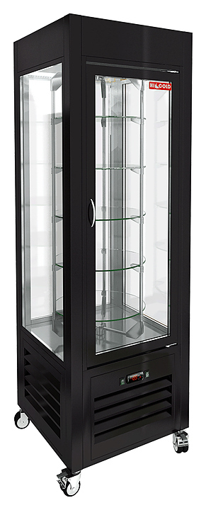 Кондитерская витрина HICOLD VRC 350 R Black используется на предприятиях общественного питания и торговли для демонстрации, охлаждения и кратковременного хранения кондитерских изделий и десертов. Модель оснащена 5 вращающимися полками и колесами со стопором. Корпус выполнен из окрашенной стали и однокамерного стеклопакета.