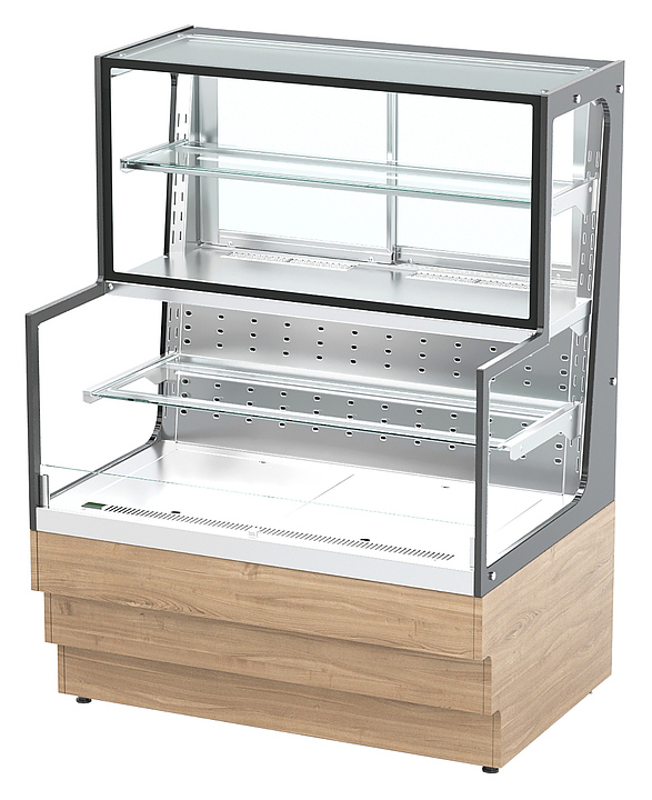 - Доступ к продуктам в верхней части витрины осуществляется со стороны рабочего персонала с помощью раздвижных створок, в нижней части – со стороны потребителя, доступ открытый