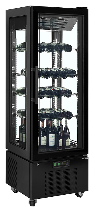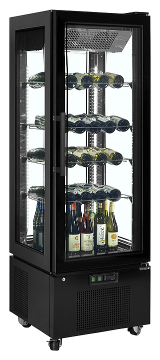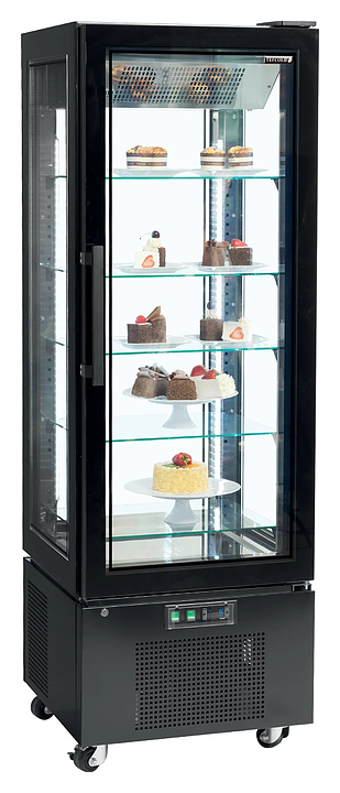 Холодильная кондитерская витрина TEFCOLD UPD400-С предназначена для эффектной демонстрации и кратковременного предпродажного хранения тортов, пирожных, других кондитерских изделий, а также бутилированных напитков на предприятиях общественного питания и торговли. Модель вертикально ориентированной формы квадратного сечения оснащена подставкой с встроенным компрессорным агрегатом и распашной дверью с рукояткой. Внутренняя облицовка выполнена из нержавеющей стали с зеркальной полировкой, экстерьер корпуса черного цвета, полки – из прозрачного стекла.