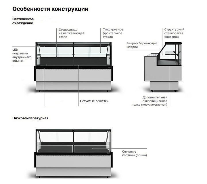 Модель без боковин предназначена для установки нескольких витрин в линию и не может использоваться как отдельностоящая. При заказе нескольких моделей для установки в линию достаточно приобрести две боковины для первой и последней витрины.