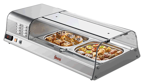 Настольная витрина Sirman VISTA EASYCOLD 100 предназначена для демонстрации, охлаждения и кратковременного хранения кондитерских изделий, пиццы на предприятиях общественного питания и торговли. Модель оснащена цифровым термостатом с дисплеем, показывающим температуру, и дополнительными световыми индикаторами.